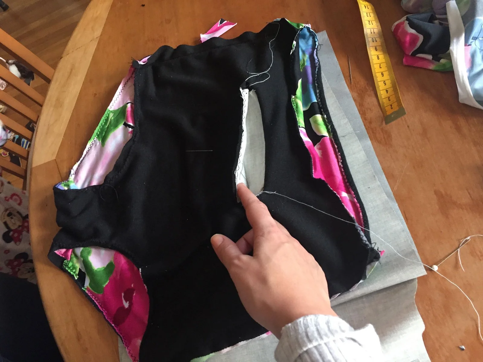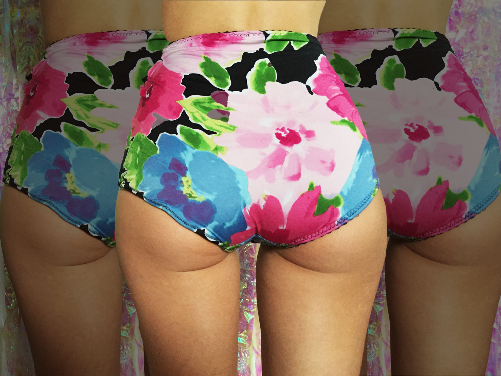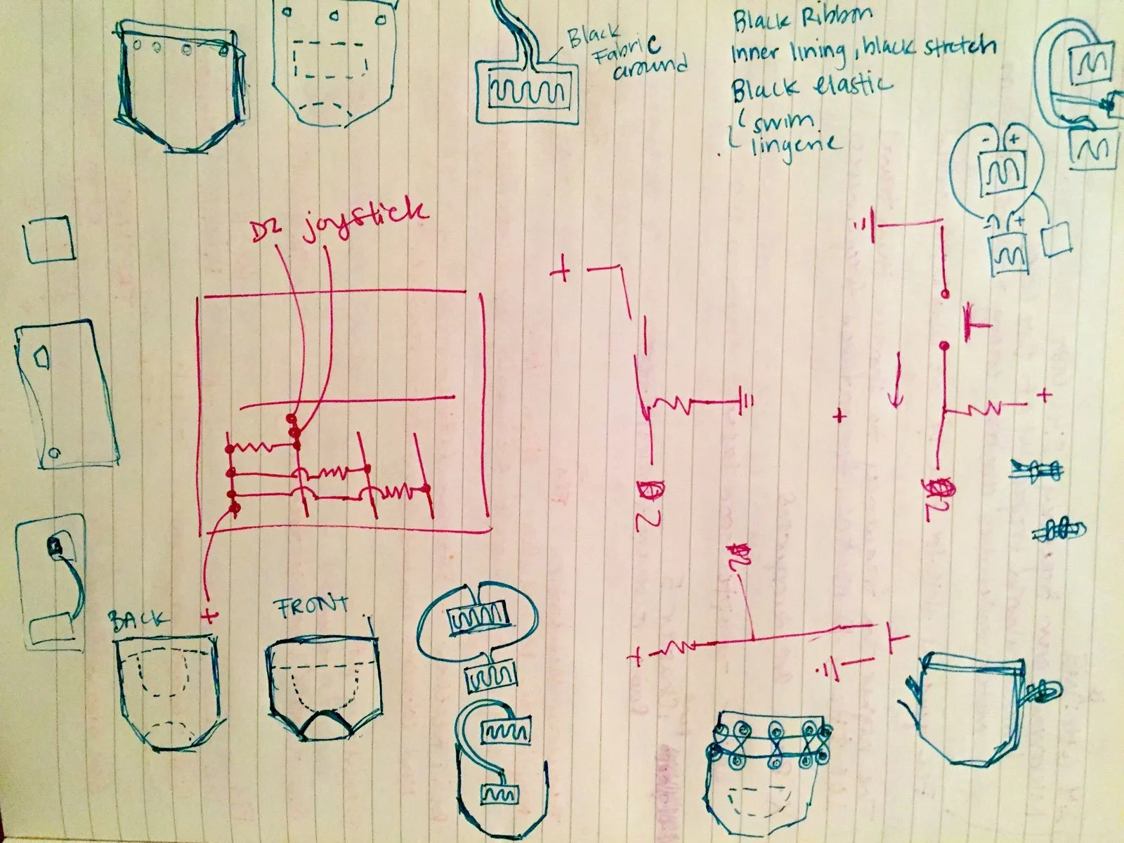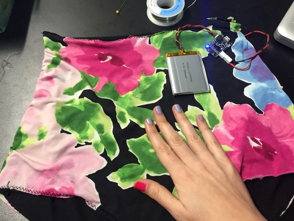 Once I got my underwear pattern together, I cut out the pieces and started sewing, weaving in steps to incorporate my electronic components using conductive thread and soft silicone wires. The only hard component was the lithium ion battery and microchip which I ended up housing in soft neoprene fabric. The microchip I used had a USB input so I could charge up the battery connected to my computer if I was at work or school. The battery pack snapped on to the garment with a snap. The final prototype for this project is below.