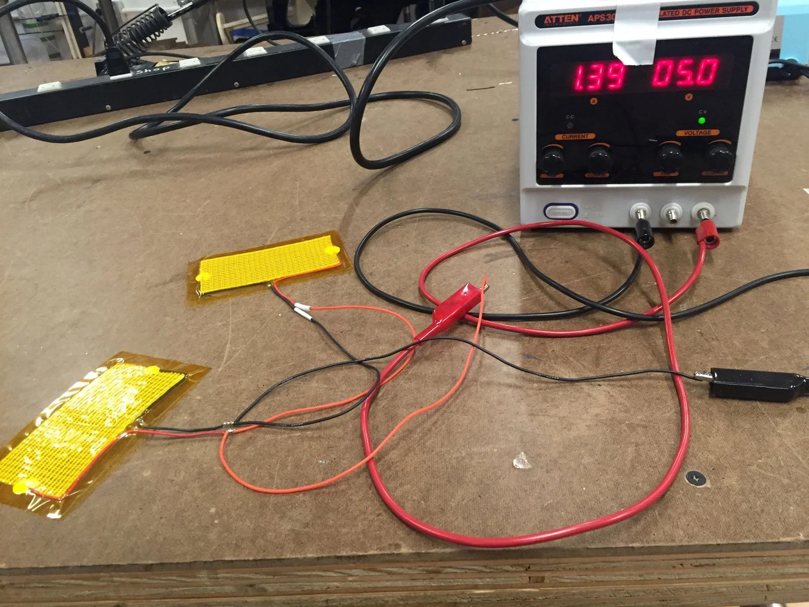 Once I decided the garment would be a pair of underwear, I started testing and designing my electronic components. I was able find thin cloth heading pads wrapped in a protective plastic-like yellow wrapping. I used two, one for the lower abdomen and one for the lower back. I wired them up to a portable power station to see how much power and amperage they needed/could handle and to figure out how to wire them once they were inside the garment.