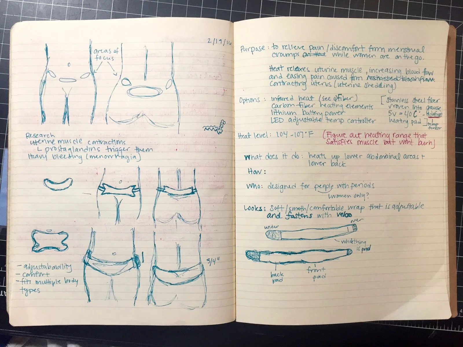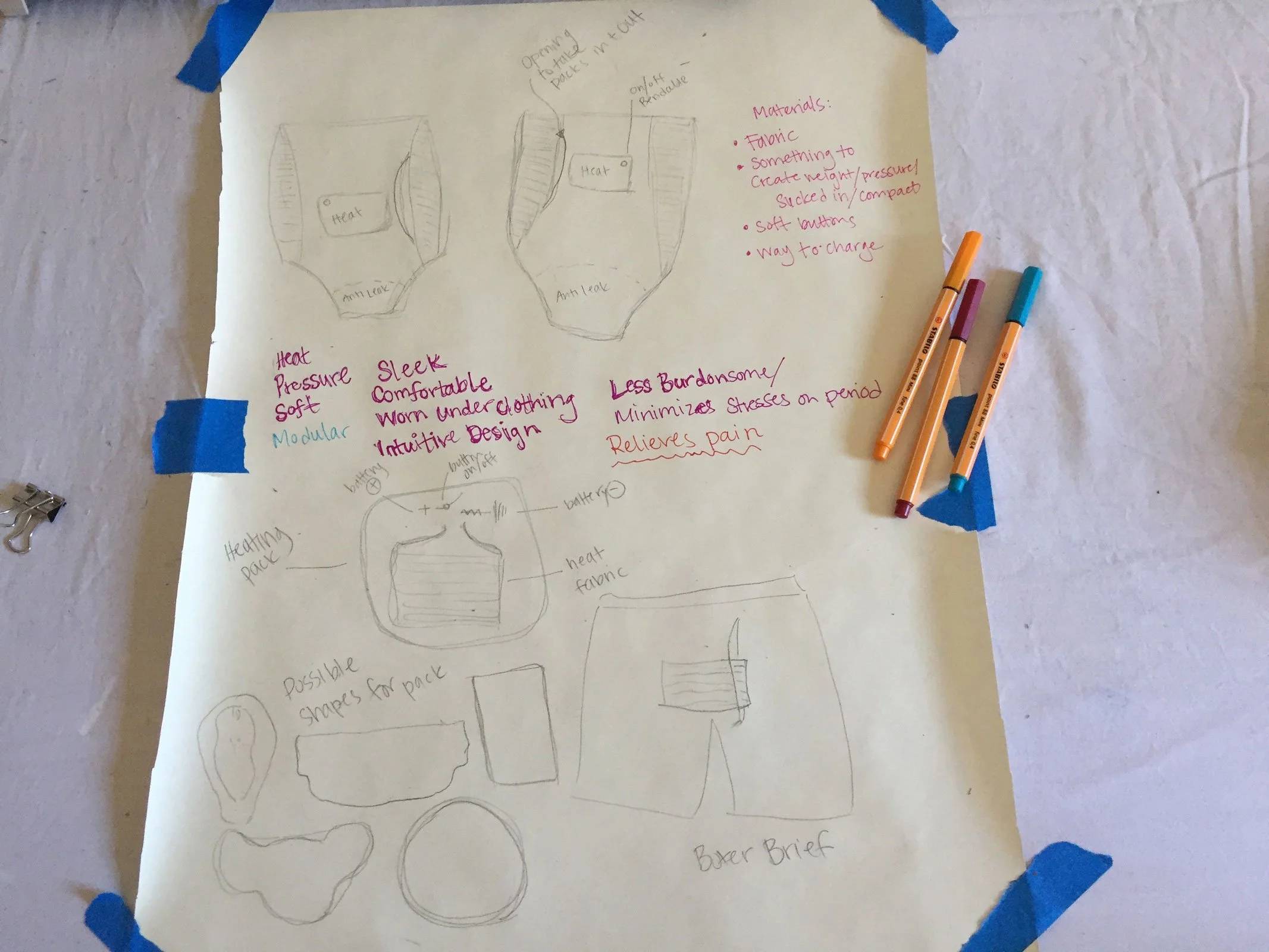 In response to pain, bloating, and over all discomfort while trying to do life on my period, I wanted to create a tool that could provide relief while I was out in the world. My period had gotten so bad that I would need at least two days in bed, with a heating pad and plenty of Ibuprofen. I was in graduate school full time and working part time so I couldn’t take off two days per month. I was taking a wearables class and decided to design a garment that could help.