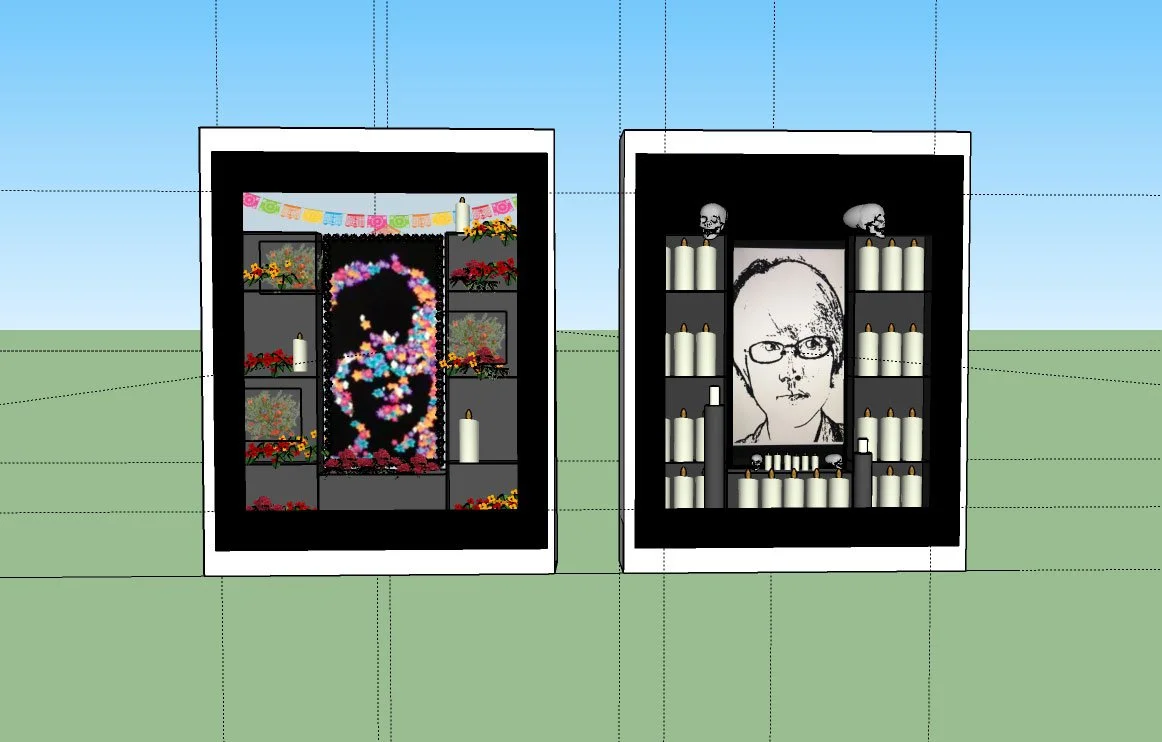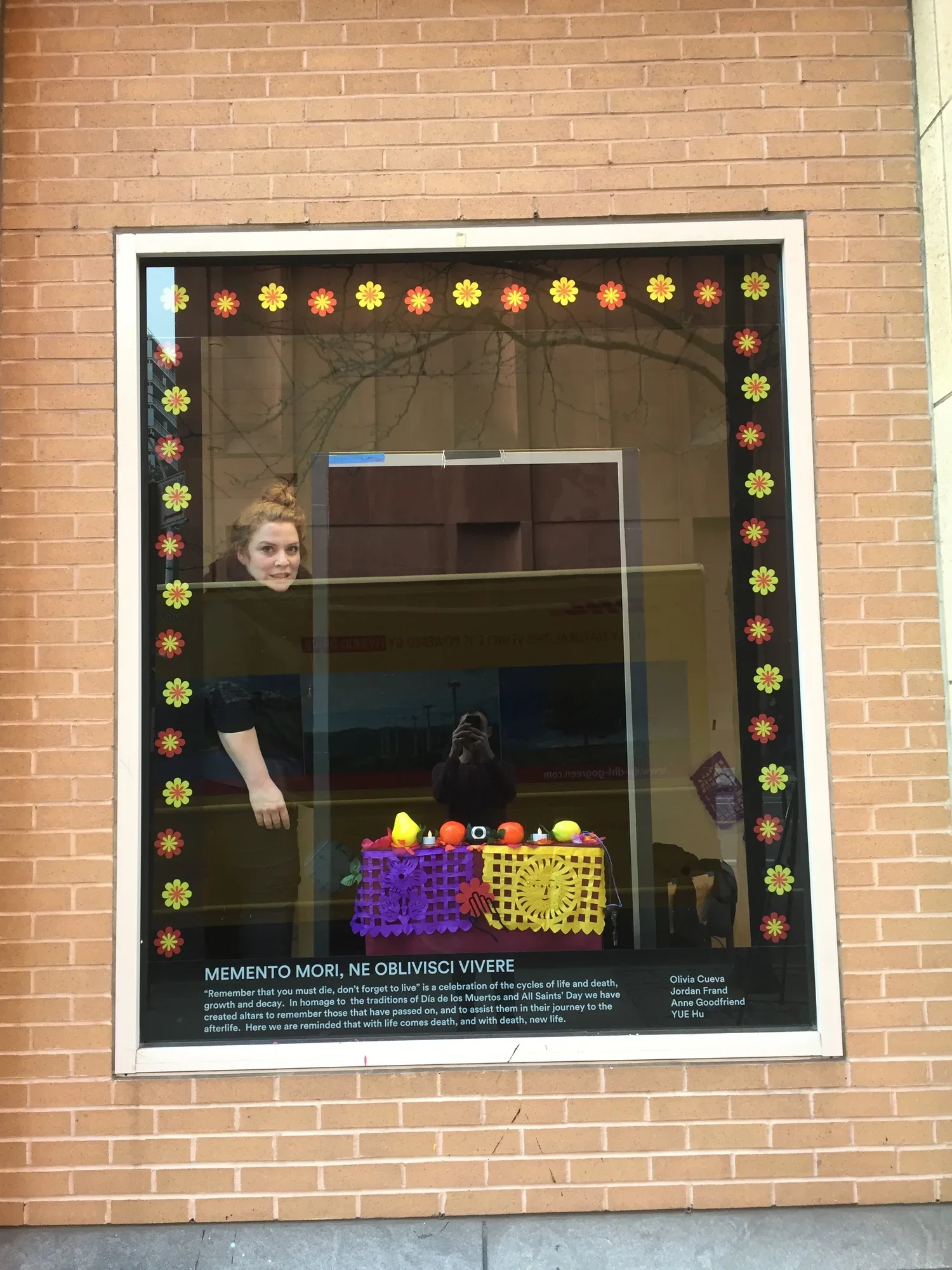 Focusing on the group exhibition theme of ‘time’ we decided that we wanted to create a pop-up window display celebrating the cycles of life and death, growth and decay. In the tradition of Día de los Muertos and All Saints Day, we created altars to remember those that have passed on, and to assist them in their journey to the afterlife.